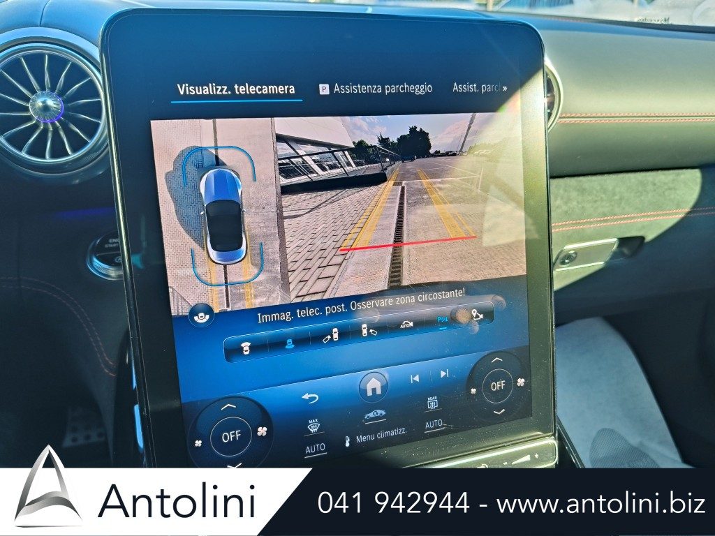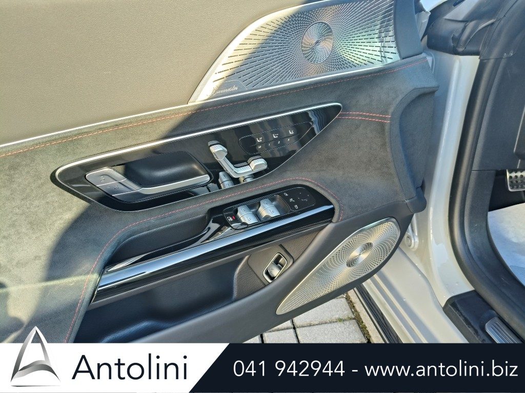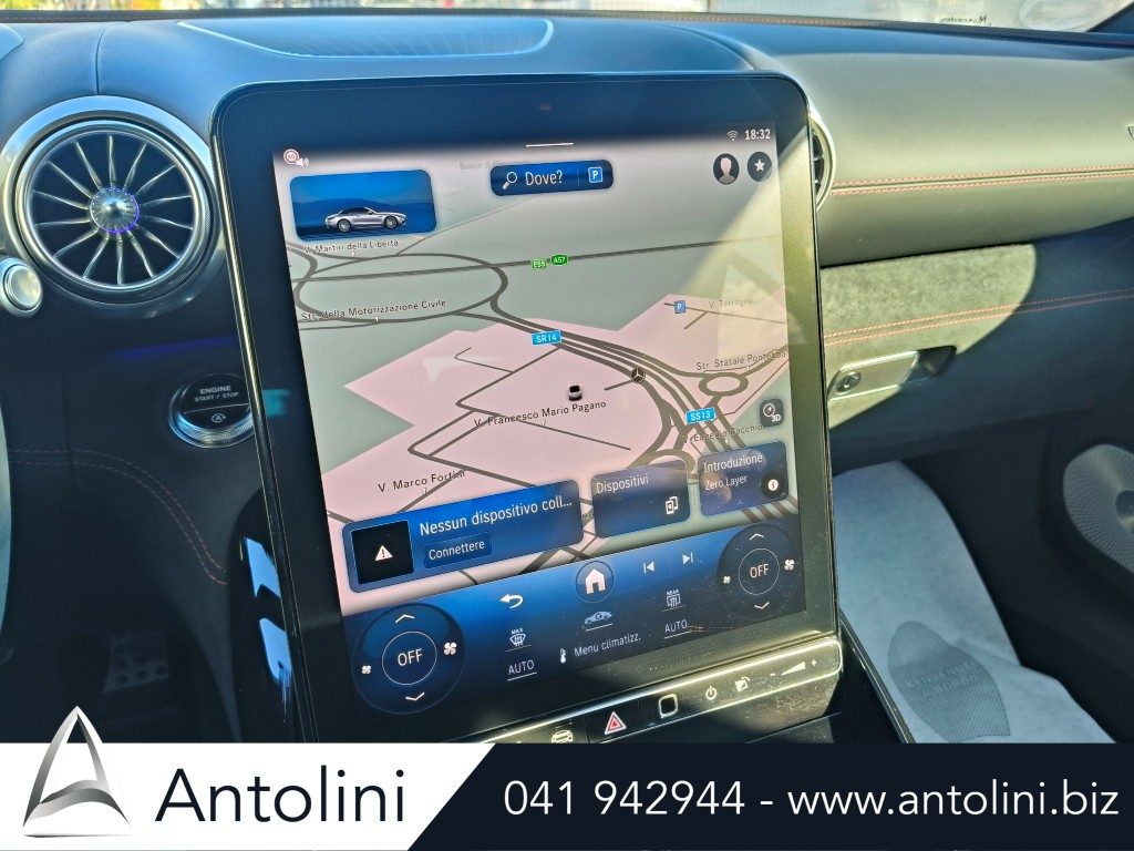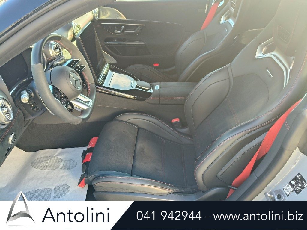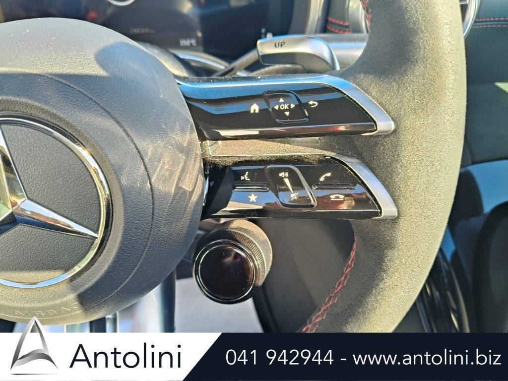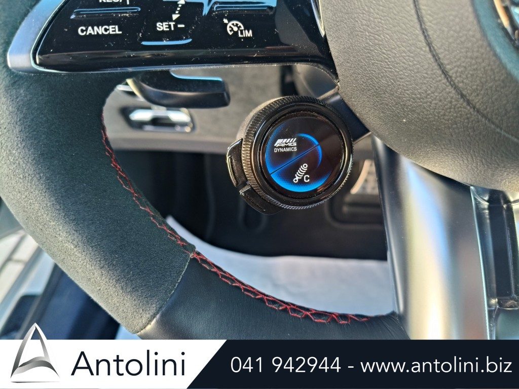 Cerchi da 18″ AMG, kit aereodinamico e sport pack AMG, dynamic select, inserti interni in carbon look, pacchetto comfort sedili, interni in pelle e microfibra, alette parasole illuminate, portabicchieri per passeggeri anteriori